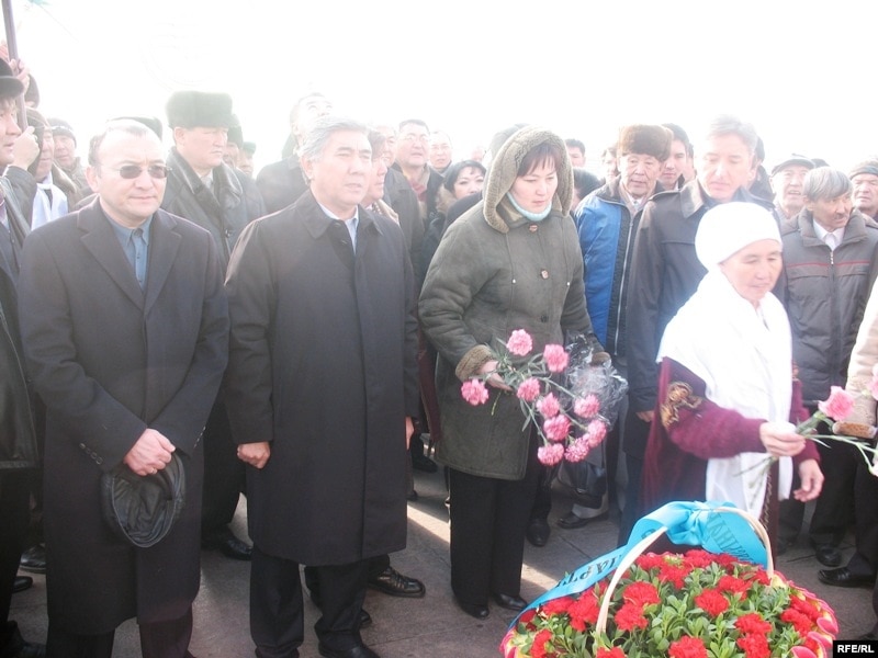 Жармахан Тұяқбай (сол жақтан екінші) және басқа оппозиция қайраткерлері Желтоқсан оқиғасына қатысушылардың құрметіне ілінген тақтайша алдына гүл шоқтарын қойды. Алматы, 17 желтоқсан 2008 жыл.