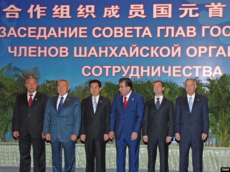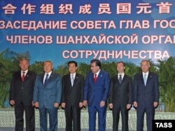 Солдан оңға: Қырғызстан президенті Құрманбек Бакиев, Қазақстан президенті Нұрсұлтан Назарбаев, Қытай төрағасы Ху Цзиньтао, Тәжікстан президенті Эмомали Рахмон, Ресей президенті Дмитрий Медведев және Өзбекстан президенті Ислам Каримов Шанхай Ынтымақтастығы ұйымының саммитінде. Душанбе, 28 тамыз 2008 жыл.