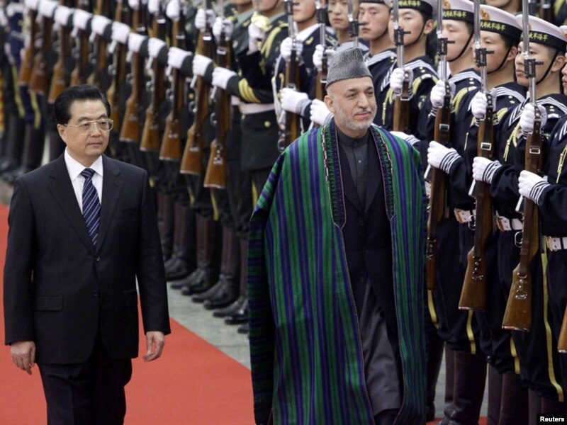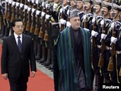 Бейжіңге сапармен келген Ауғанстан президенті Хамид Карзай (оң жақта) өзінің құрметіне сап түзеген қарауыл алдында Қытай төрағасы Ху Цзиньтаомен бірге келе жатыр. 24 наурыз 2010 жыл.
